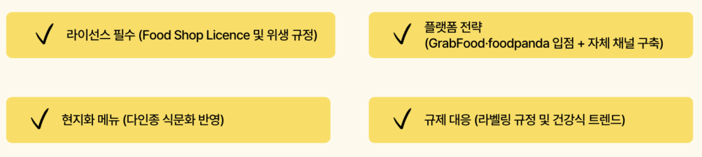 - SFA 승인: 매장 레이아웃, 환기, 주방 설비가 위생 기준을 충족해야 함.